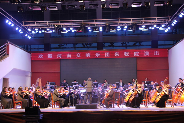 為進一步豐富校園文化生活,引領當代大學生弘揚優秀民族文化,提高我院學生的藝術修養和文化素質,4月23日晚7點,河南省2014年高雅藝術進校園河南交響樂團走進我院,專場音樂會在我院大學生活動中心隆重舉行。學院黨委書記張桂蘭、副院長肖世才以及各系處的領導、老師、同學共計3000餘人共同觀看了演出。
