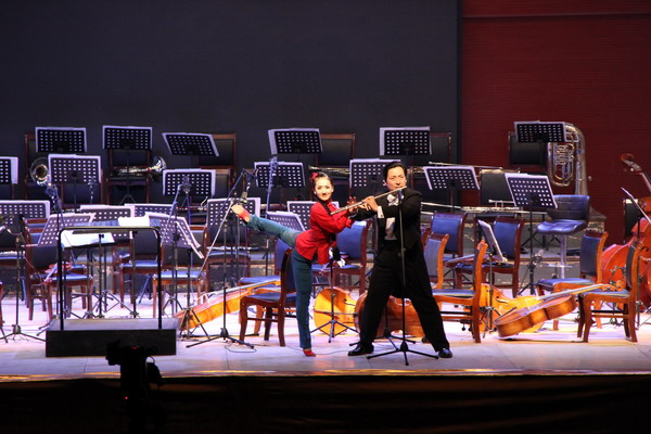 來自河南省歌舞劇院交響樂團的近百名演奏家們在我省著名指揮家嶽輝先生的指揮下,為我院廣大師生傾情演奏了活潑明快的《蝙蝠序曲》、中國舞劇《紅色娘子軍》選曲、經典作品《天鵝湖》、《波基上校進行曲》、《掀起你的蓋頭來》等不同時期、曲風各異的中外名曲。我省青年歌唱家王園園将一曲《蘆花》娓娓唱來,為現場增添了一縷清新的田園氣息,接着又以一曲《龍船調》帶動了全場觀衆的熱情。著名長笛演奏家董世英為大家帶來了《白毛女》和《你是風兒我是沙》的演奏,其獨特的藝術展現手法深深感染了在場所有聽衆。随後,演奏家們又為廣大師生觀衆帶了一系列大家熟悉而又喜愛的影視音樂作品《龍貓》、《風之谷》、《加勒比海盜》和《激情燃燒的歲月》,掀起了整個音樂會的又一個高潮。